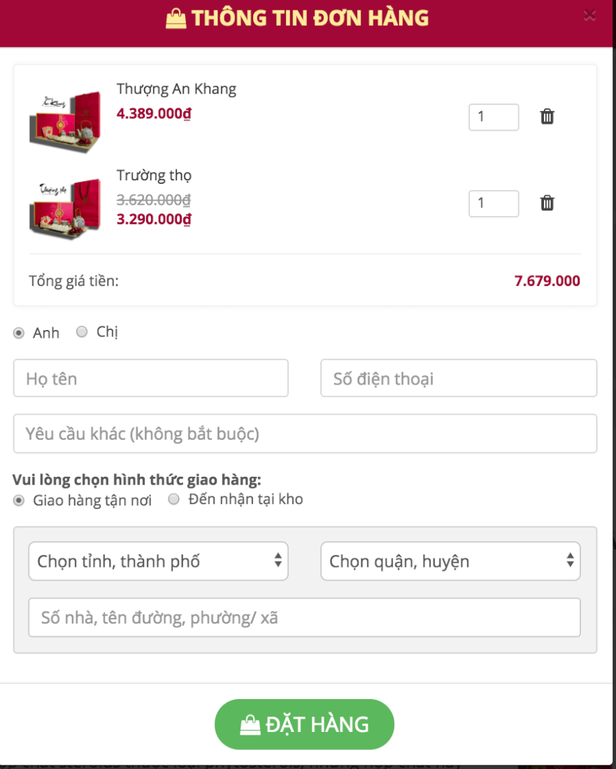 + Điền đầy đủ các thông tin mua hàng theo các bước trên website: số lượng mua, họ tên người nhận, số điện thoại, thông tin khác (không bắt buộc) , sau đó chọn hình thức nhận hàng là giao hàng tận nơi hay đến showroom lấy hàng, nếu là giao tận nơi vui lòng điền thông tin địa chỉ nhận hàng và kết thúc bằng việc nhấn đặt hàng.